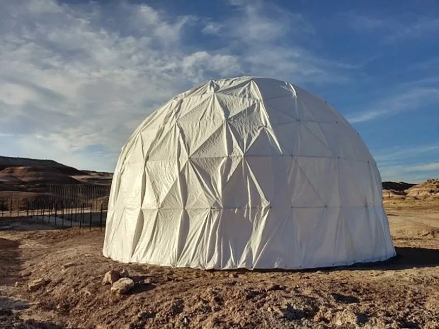 The Science Dome is a 7-meter geodesic dome housing a microbiological and geological laboratory.